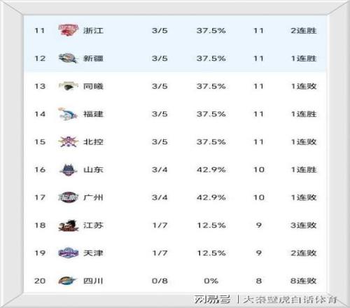 ⑤、新赛季8连败的四川男篮仍然难尝一胜,排名垫底,天津队和江苏队同为1胜7负,排名倒数二三位。